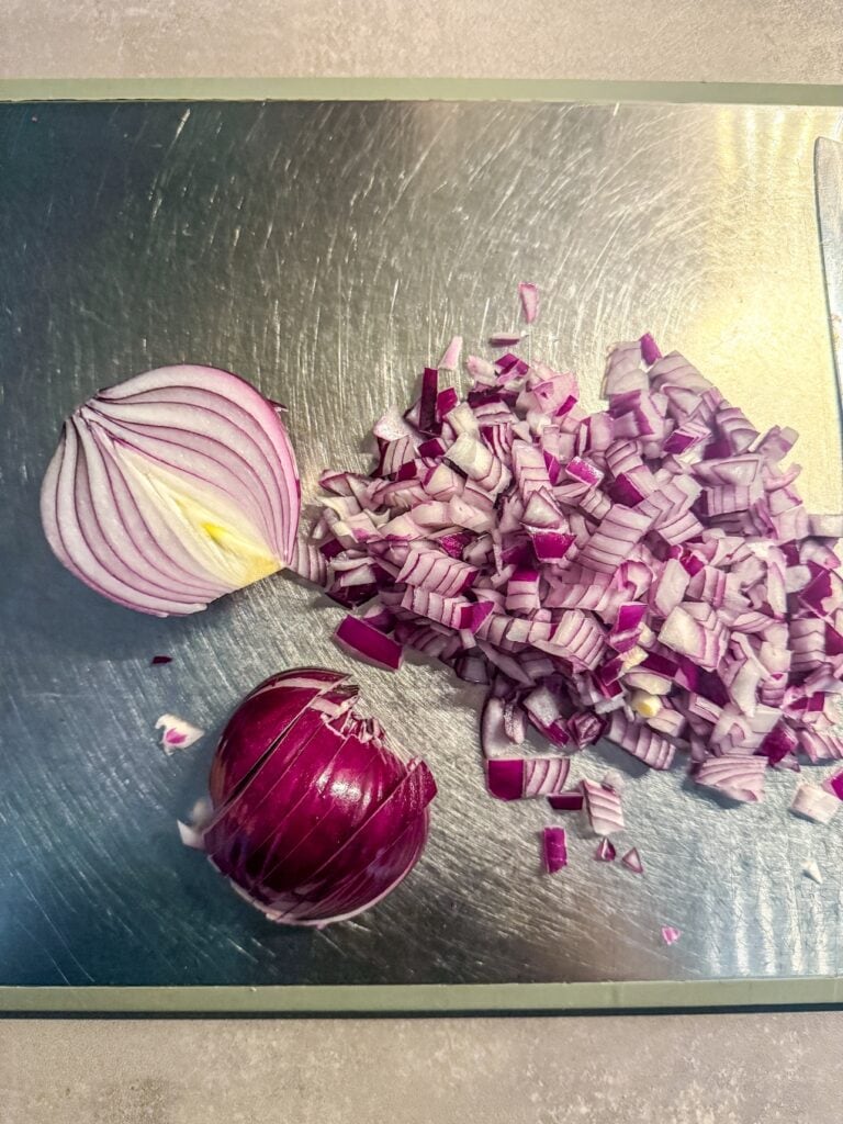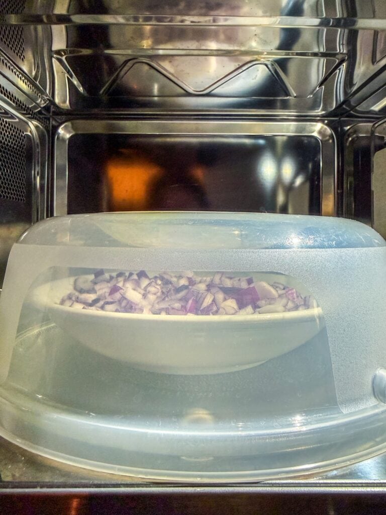 - Zwiebeln schälen, fein würfeln und für 2,5 Minuten bei 800 Watt in der Mikrowelle vorgaren.👉 Sorgt für mehr Saftigkeit und milderen Geschmack.