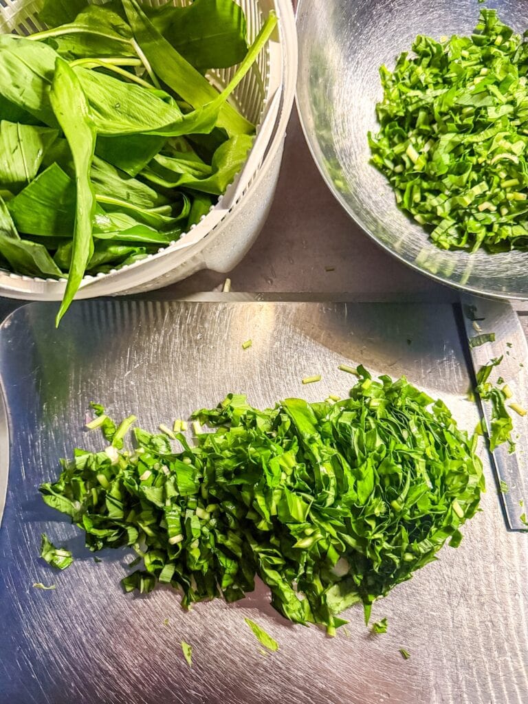 - Bärlauch gründlich waschen, trocken schleudern und fein hacken.