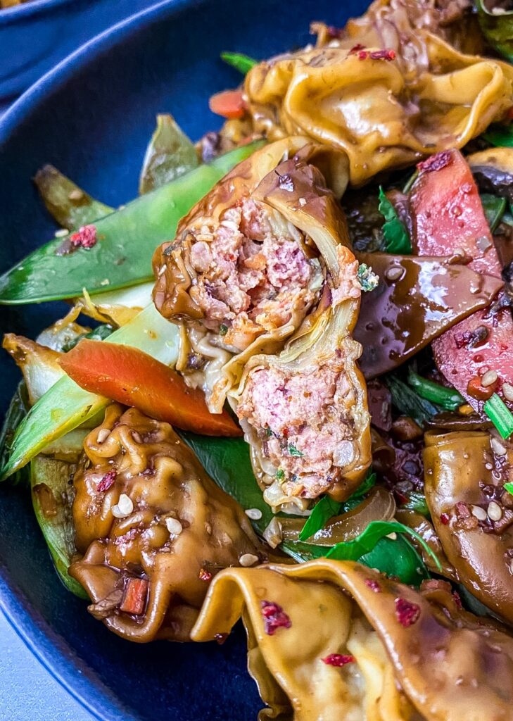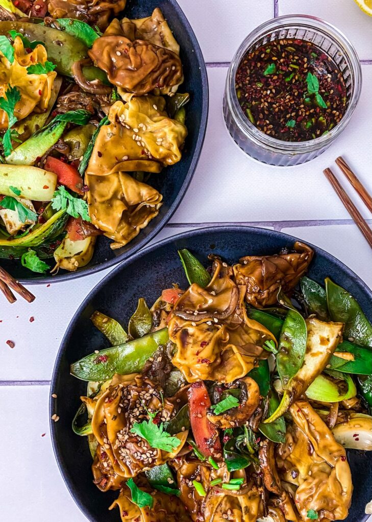 Das Ergebnis: Zart gefüllte Wan Tan, umhüllt von würzigem Gemüse, leicht nussigem Sesam und einer glänzenden Sojasauce. Einfach, schnell und unfassbar gut.