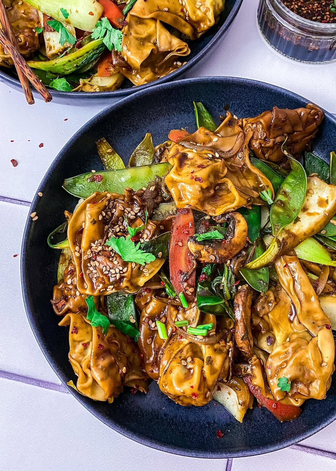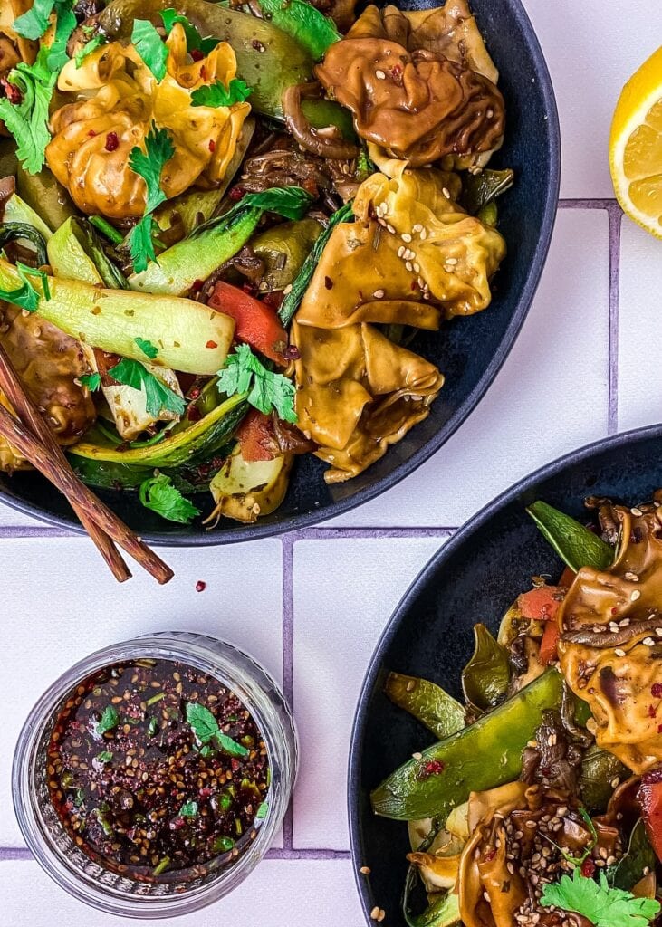 Das Ergebnis: Zart gefüllte Wan Tan, umhüllt von würzigem Gemüse, leicht nussigem Sesam und einer glänzenden Sojasauce. Einfach, schnell und unfassbar gut.