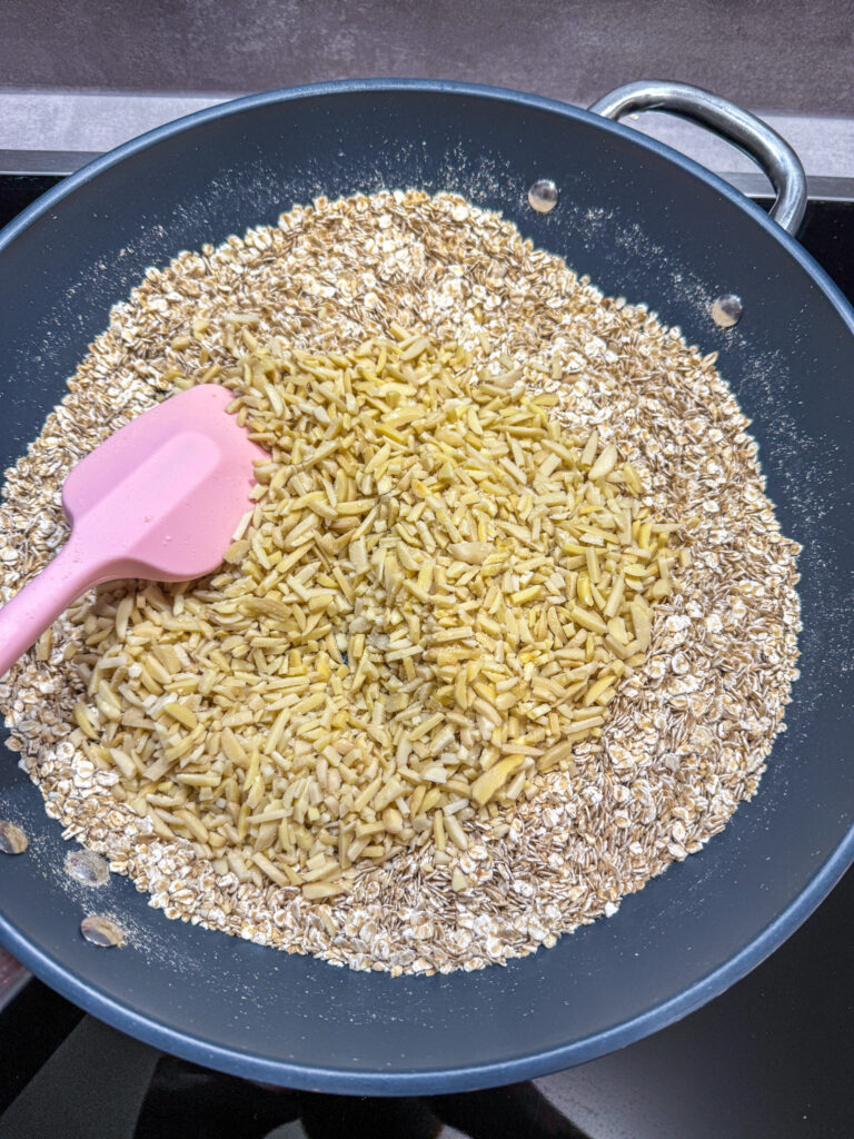 - Die Mandeln und Haferflocken in einer Pfanne ohne Fett oder für ca. 5 Minuten in der Heißluftfritteuse rösten, bis sie duften und leicht Farbe annehmen. Abkühlen lassen.