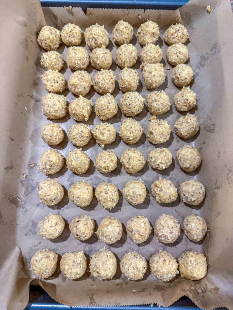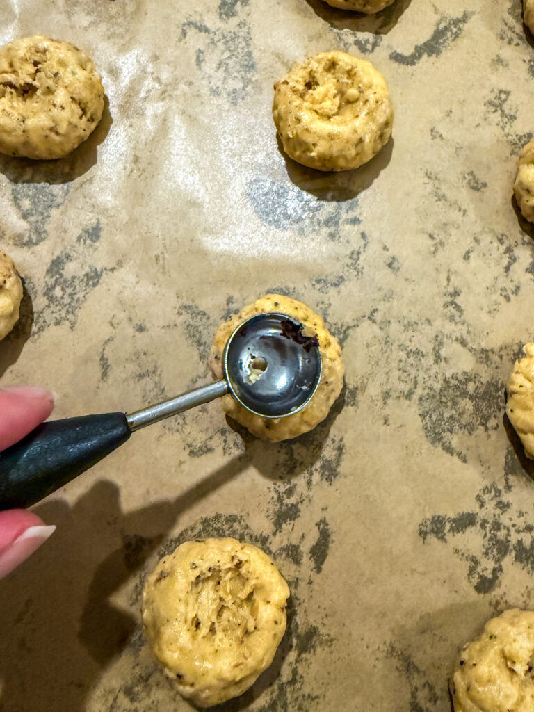 - Kleine Kugeln (z. B. mit der größeren Seite eines Melonenkugelformers) abstechen und in der Mitte mit einem feuchten Löffel oder Melonenausstecher (kleine Seite) mittig eine Mulde formen. Alle Plätzchen auf Backpapier legen, mit Folie oder Backpapier (zwischen den Schichten) trennen und 1–2 Stunden (oder über Nacht) im Kühlschrank ruhen lassen.