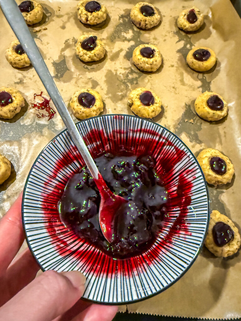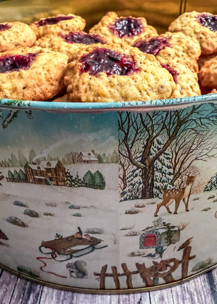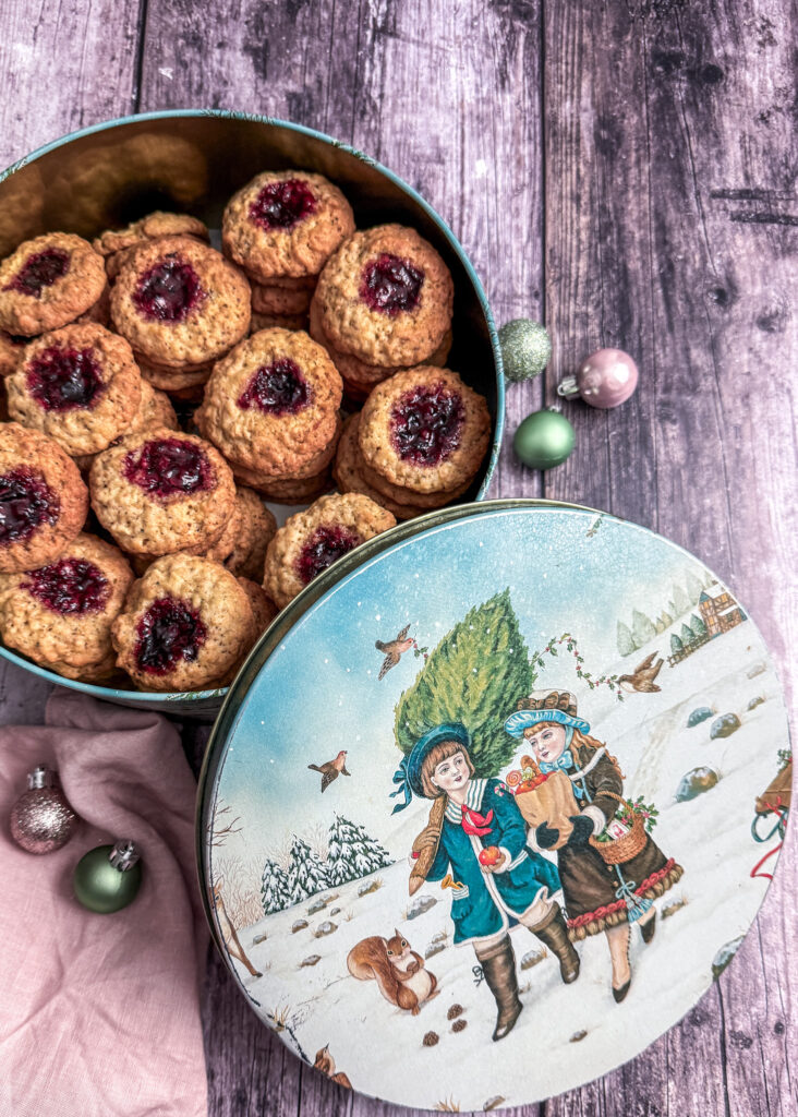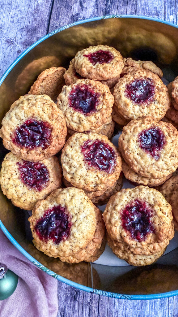 Zu Uni-Zeiten bekam mein Mann jedes Jahr von ihm eine große Dose dieser Plätzchen – und teilte sie großzügig mit seinen Kommilitonen. Ich erinnere mich noch genau an den Moment, als ich das erste Mal eines probiert habe: knusprig, nussig, karamellig und mit dieser kleinen Fruchtbombe in der Mitte. Einfach perfekt.