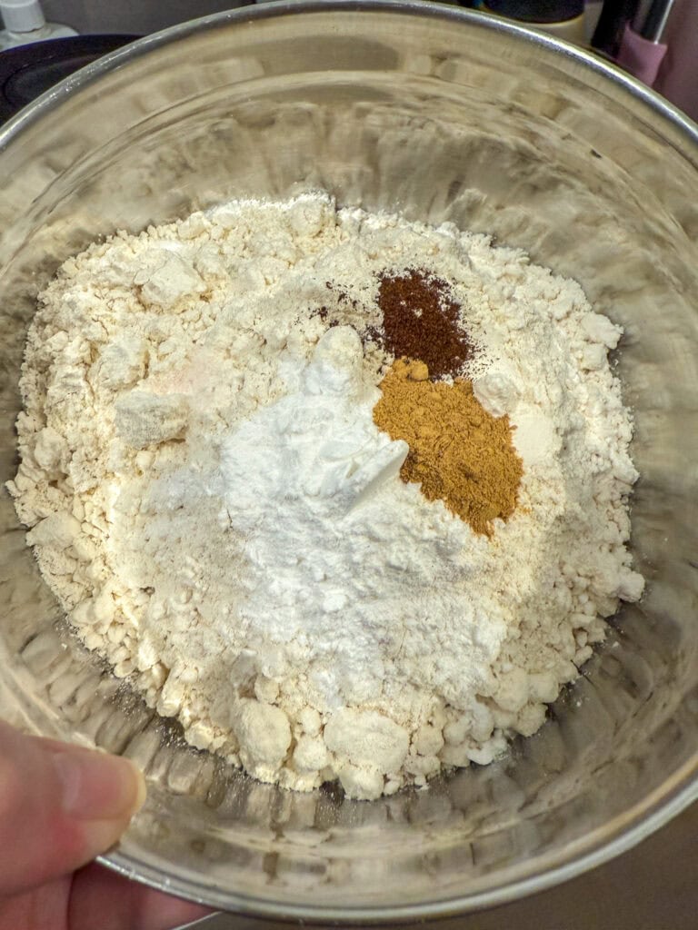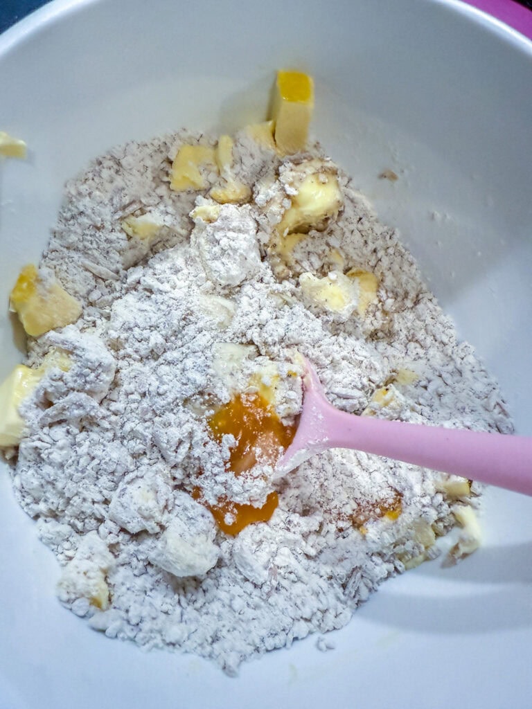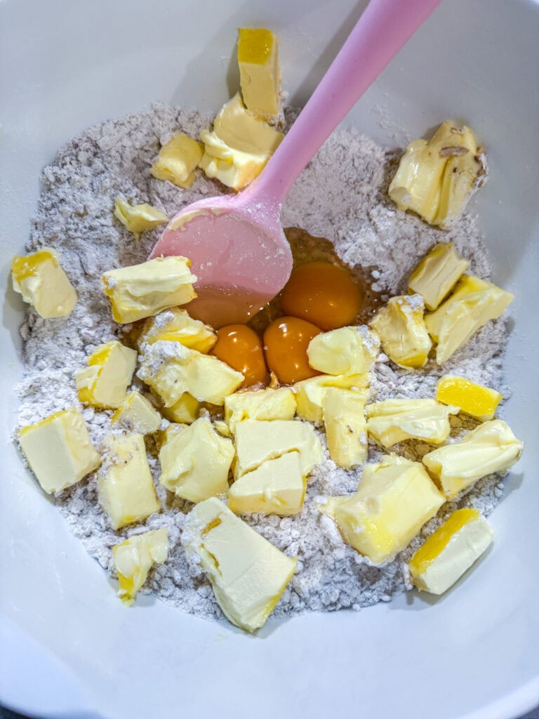 - Alle trockenen Zutaten miteinander vermischen, anschließend mit Butterstückchen und Eiern zu einem homogenen Teig verarbeiten: erst grob mit einem Kochlöffel verrühren und anschließend mit den Händen oder dem Handmixer kneten.
