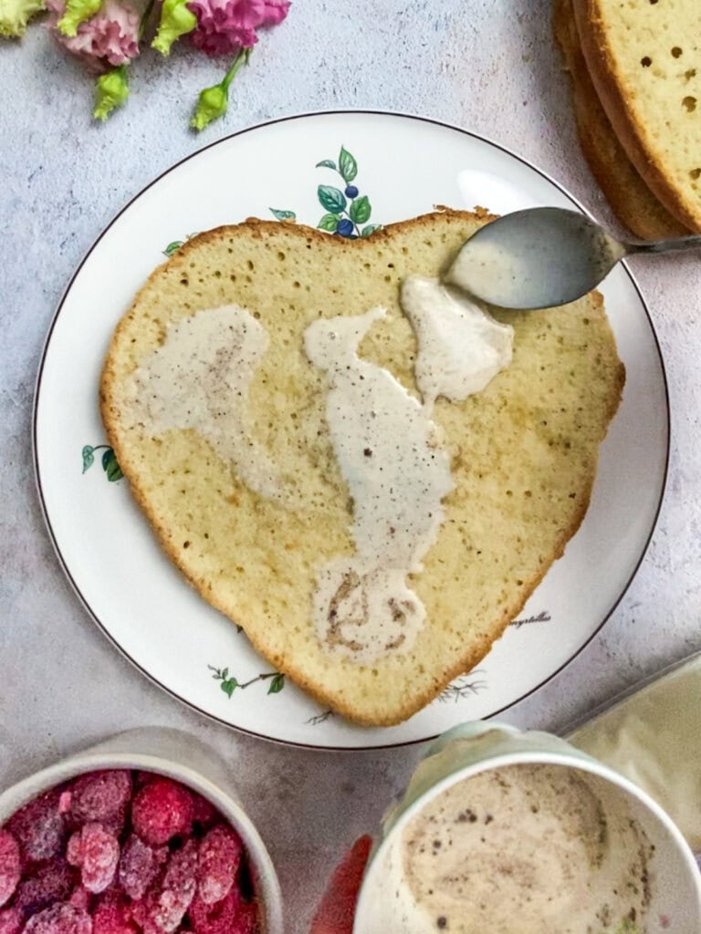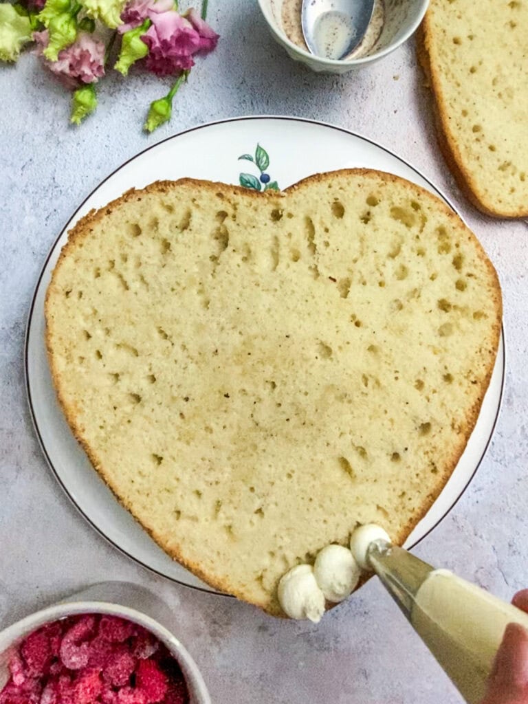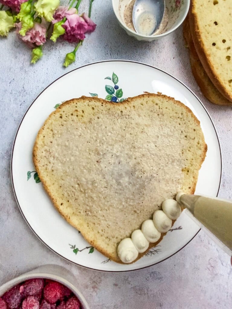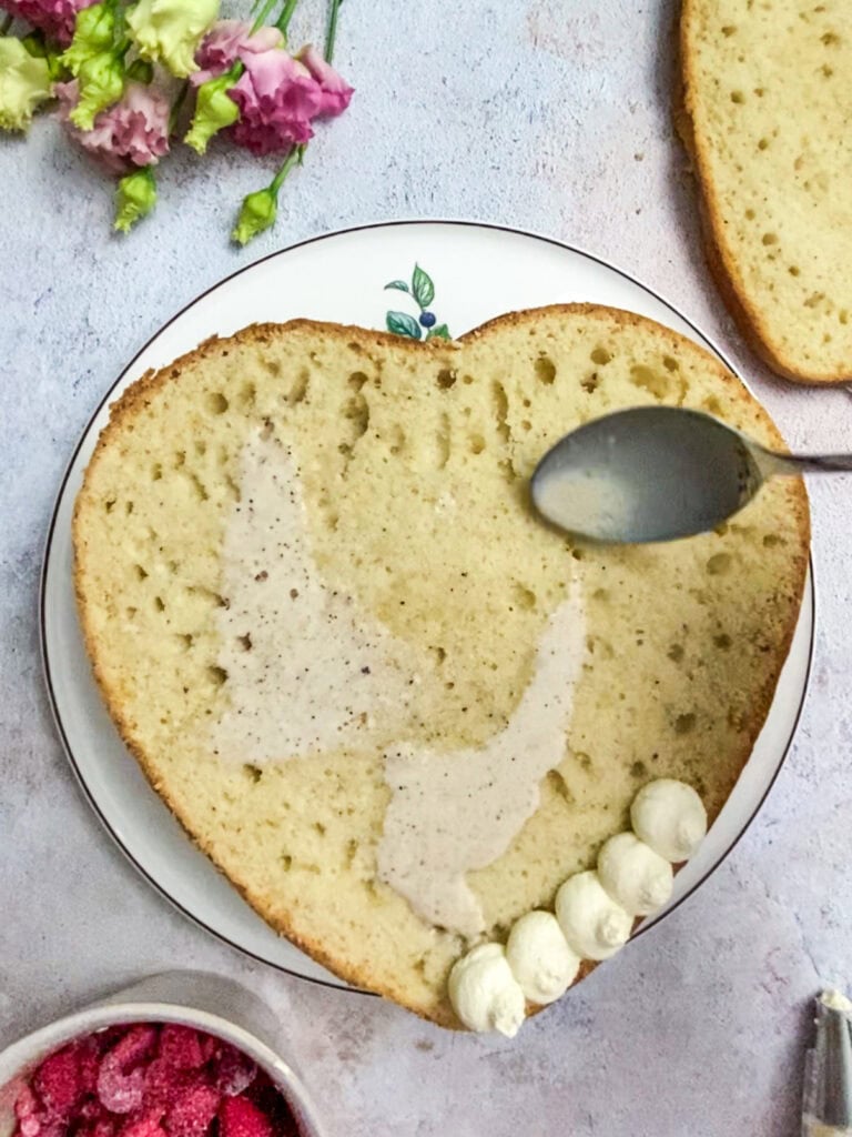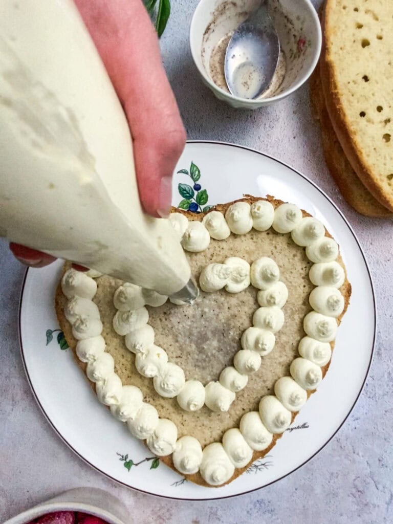 Mit der Creme und den Erdbeeren kaschierst du alles perfekt – und die Torte sieht aus, als hättest du eine spezielle Herzform verwendet. 💕