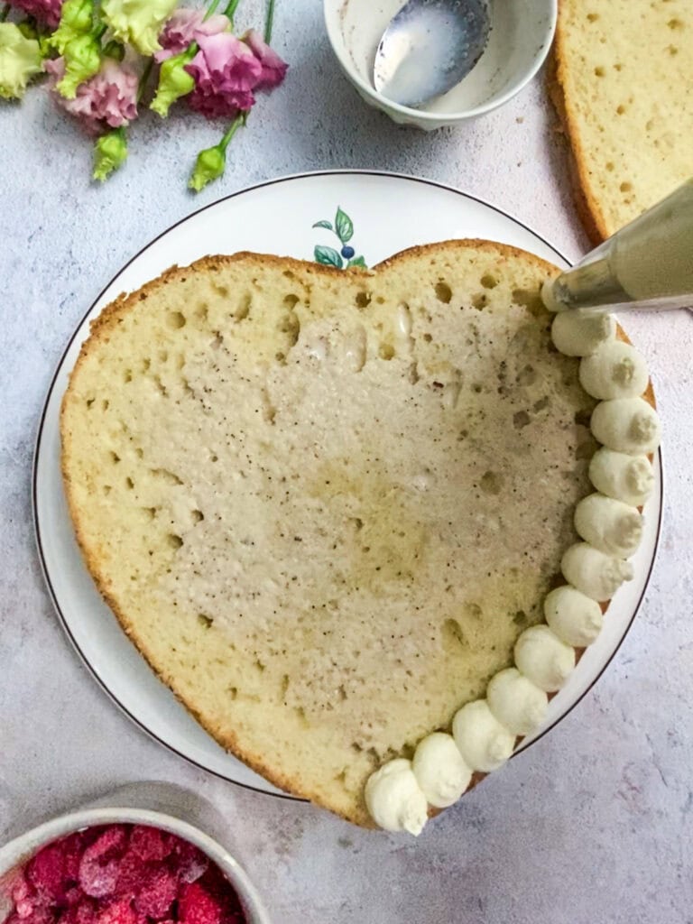 • Tränke, Creme-Tupfen und Himbeer-Schicht wiederholen.