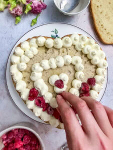 Zwischen die Cremetupfen kommen die Himbeeren – fertig.