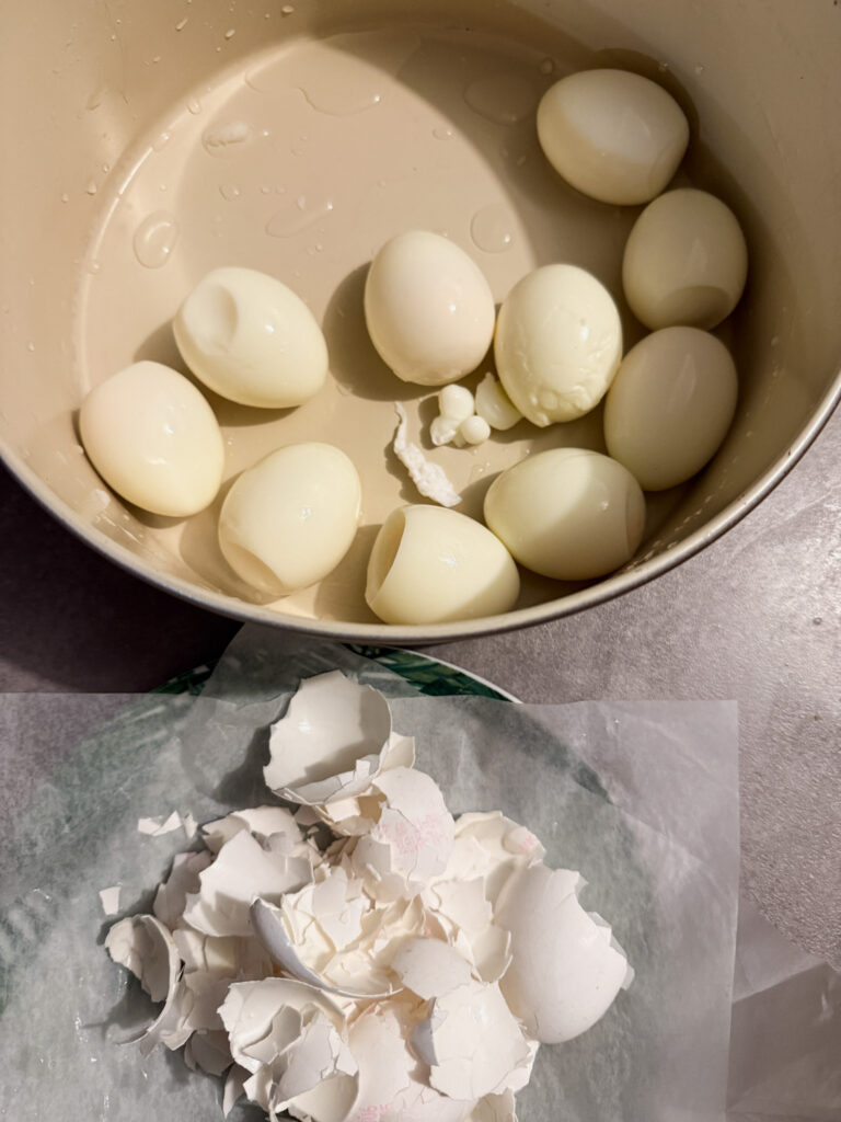 - Eier je nach gewünschter Konsistenz kochen, in Eiswasser abschrecken, pellen und abkühlen lassen.