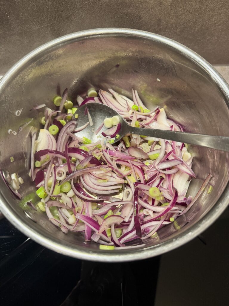 - Zwiebeln in Streifen schneiden, das Weiße der Frühlingszwiebeln in Ringe. In 1 EL Öl glasig dünsten. (Zwiebelgrün beiseite stellen.)