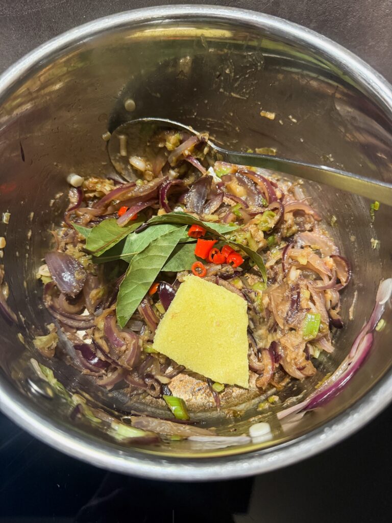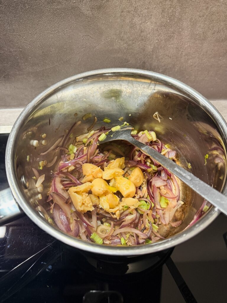Am liebsten verwende ich dafür confierten Knoblauch, der ein feineres Aroma hat – frischer Knoblauch funktioniert aber genauso gut und lässt sich wunderbar mit den Zwiebeln anschwitzen. 🧄💛