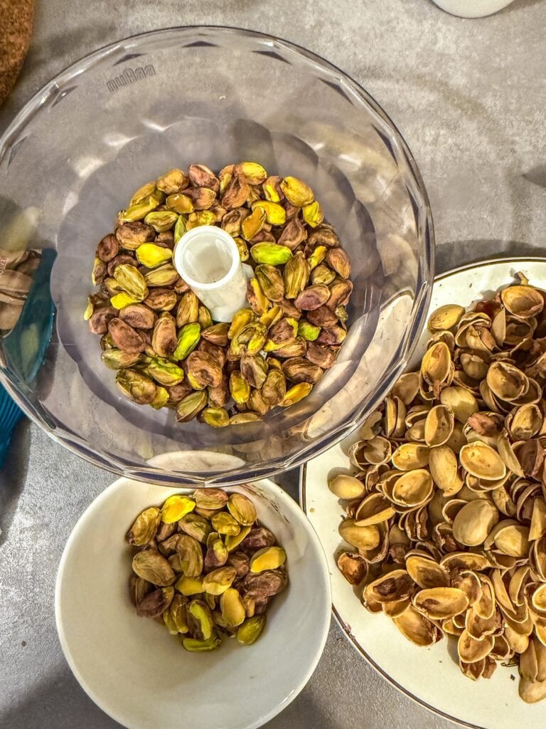 Wenn du im Supermarkt keine bereits geschälten Pistazien* findest (was gar nicht so selten ist), kannst du sie ganz einfach selbst knacken und schälen – das dauert zwar ein bisschen, lohnt sich aber! Eine 250 g-Packung ungeschälter, gerösteter und ungesalzener Pistazien* ergibt etwa 130 g geschälte Nüsse, perfekt für eine Rezeptmenge.