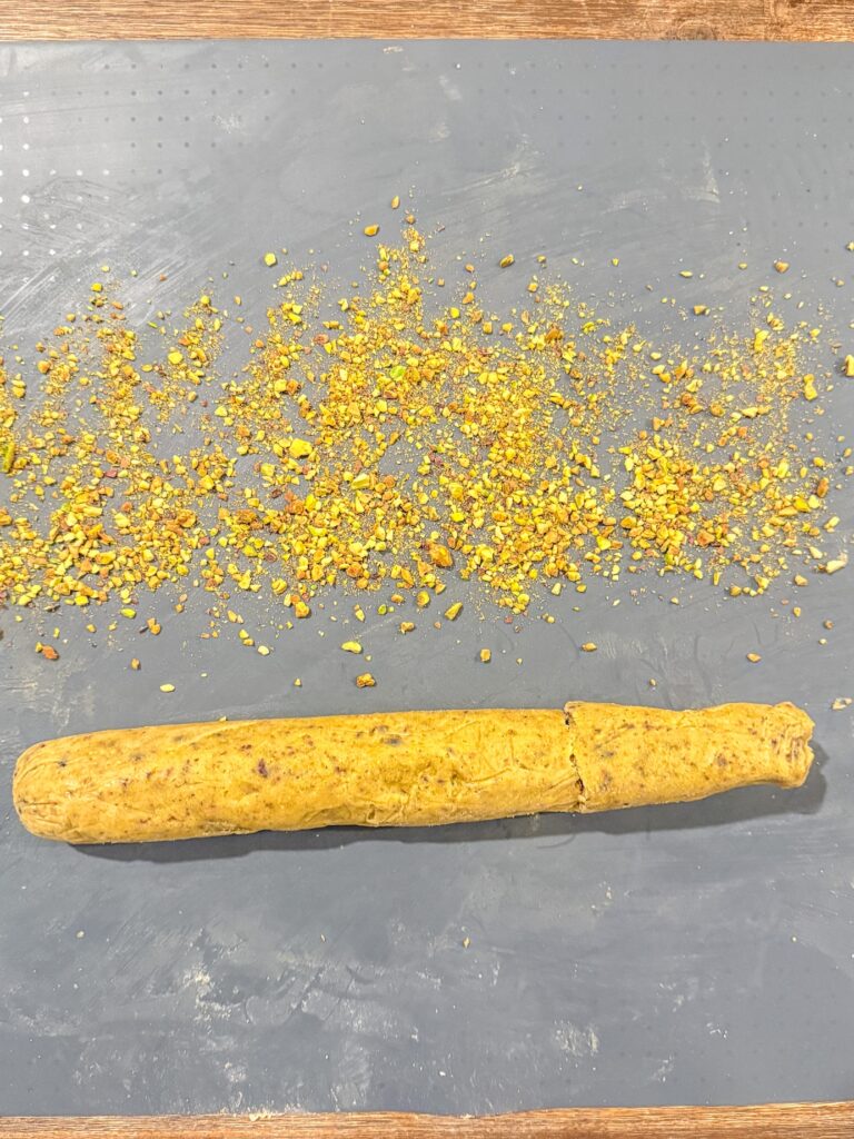 - Die gekühlten Rollen in den gehackten Pistazien wälzen, bis sie gleichmäßig bedeckt sind.