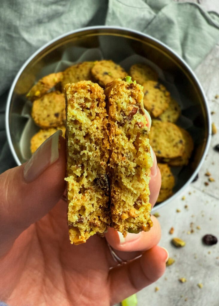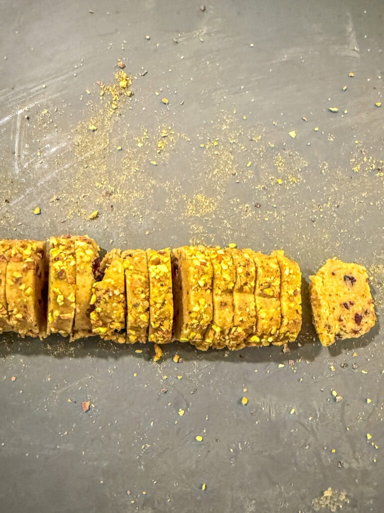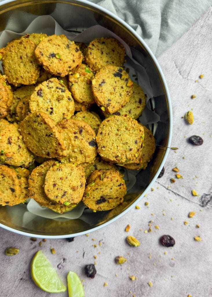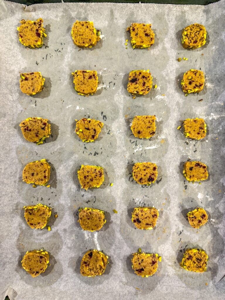 Das Rezept ist für mich eines der besten Beispiele dafür, dass Backen nicht kompliziert sein muss. Denn hier gilt: kein Ausstechen, kein Kühlen von geformten Plätzchen, kein großes Chaos in der Küche. Einfach Teig zusammenkneten, aufrollen, kühlen, in Scheiben schneiden und ab in den Ofen. Das Ergebnis? Zart mürbes Shortbread, das beim Reinbeißen fast auf der Zunge zerfällt, dazu die feine Nussigkeit der Pistazien und die fruchtige Süße der Cranberries. 🍋