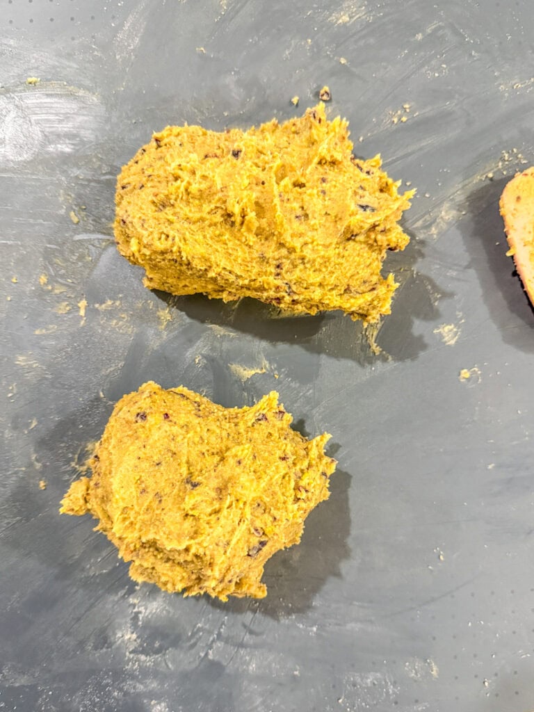 - Die Rollen in ca. 1 cm dicke Scheiben schneiden und auf ein mit Backpapier belegtes Blech mit ausreichend Abstand legen.