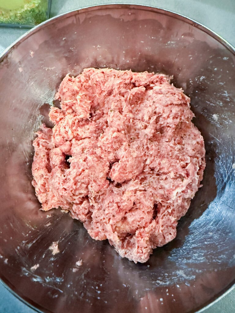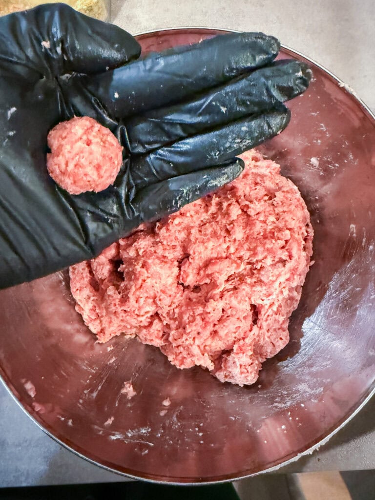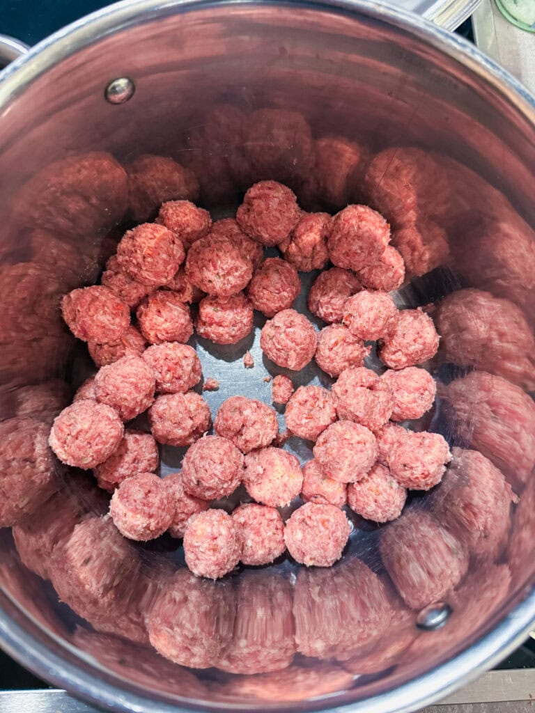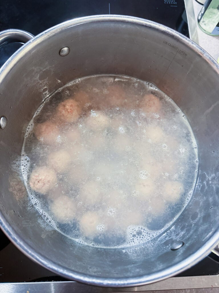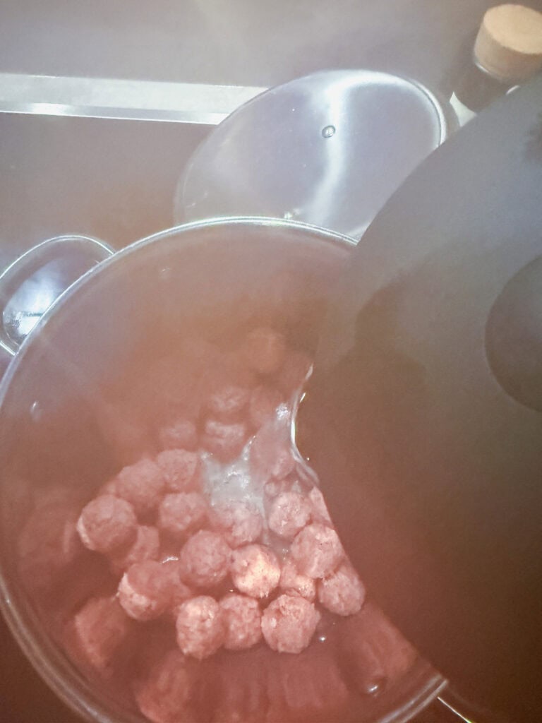 - Hack mit Ei, Gewürzen & Speisestärke vermengen. Kleine Klößchen (je ein großzügiger TL) formen und direkt in einen großen Topf legen. In der Mitte etwas Platz freilassen.