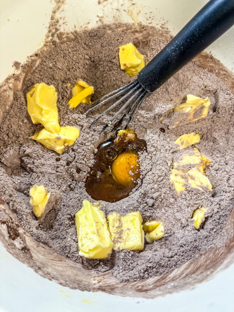 - Butter in Stückchen sowie Ei dazugeben und zu einem homogenen Teig verkneten.
