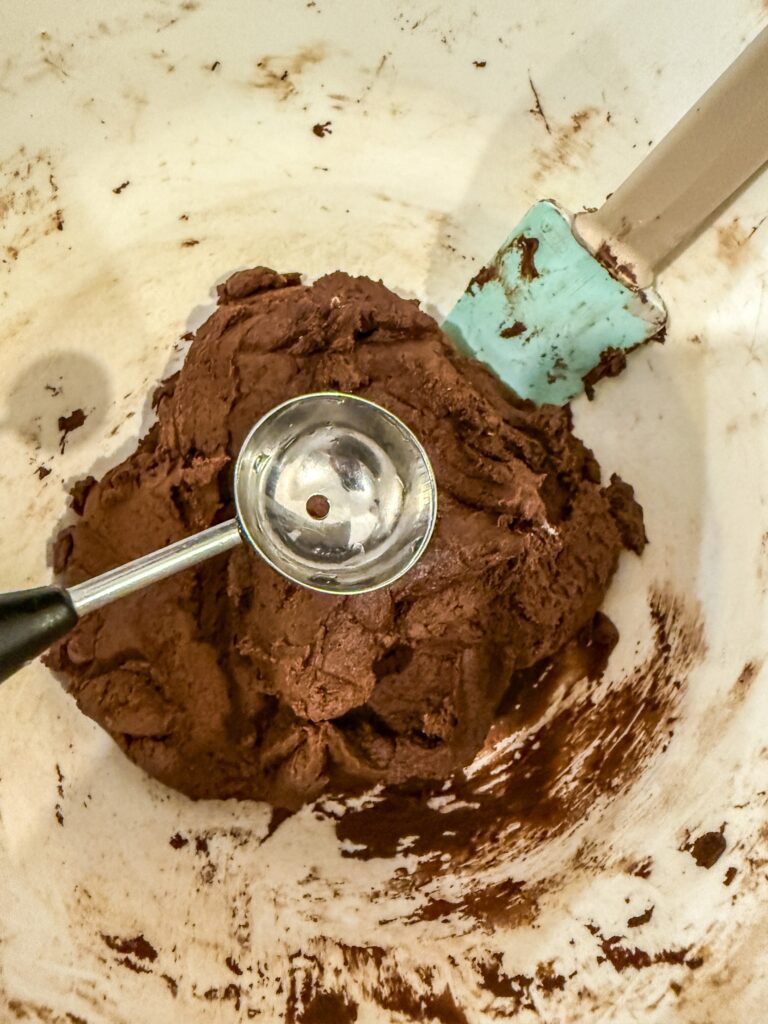- Kleine Kugeln (ca. 3 cm Durchmesser, mit der größeren Seite eines Melonenkugelausstechers) formen und mit etwas Abstand auf ein Blech legen.